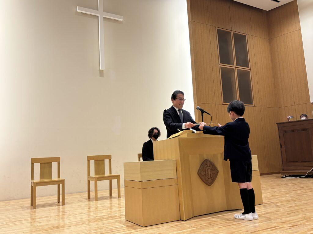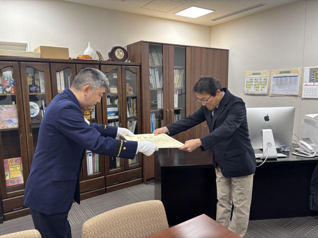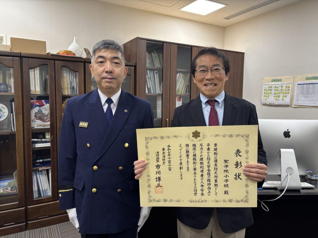 聖学院小学校の校舎が優良防火対象物として長い間認められていることで、東京消防庁より表彰されました。11日の表彰式には伺えなかったので、校長室で授与されました。これからも、児童や関わるすべての方々の人命安全確保に尽力していきたいと思います。