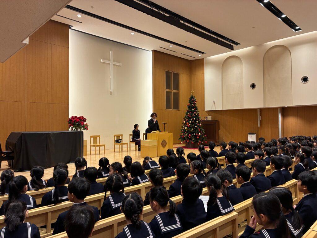 11月27日(木)全校礼拝の中で小学校チャペルのクリスマスツリーにあかりを灯しました。点火の役は児童宗教委員会の児童4名。薄暗いチャペルの中に浮かび上がった輝くツリーに「うわー!」と感嘆の声が上がり、クリスマスを迎える準備が始まりました。