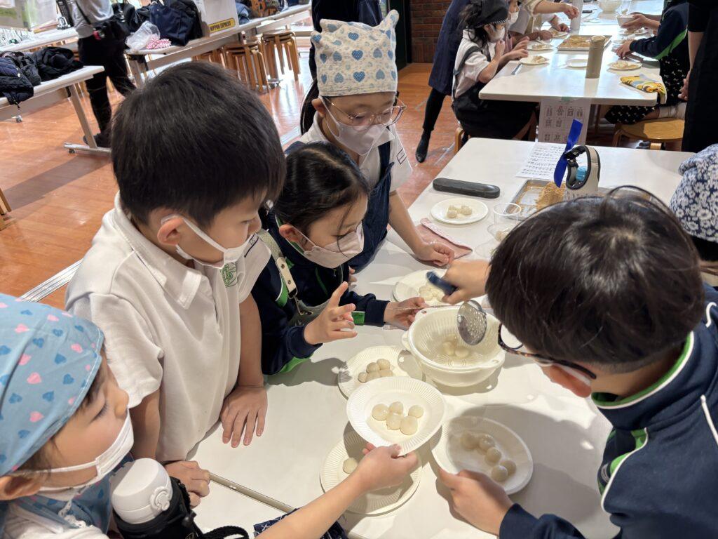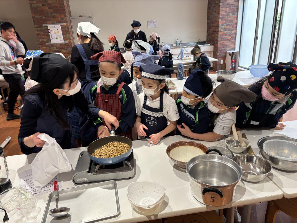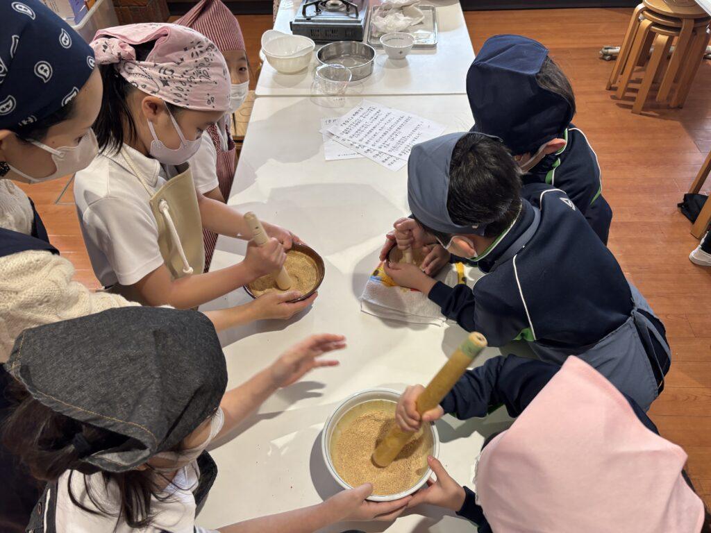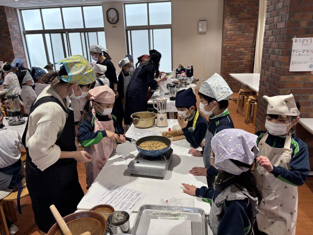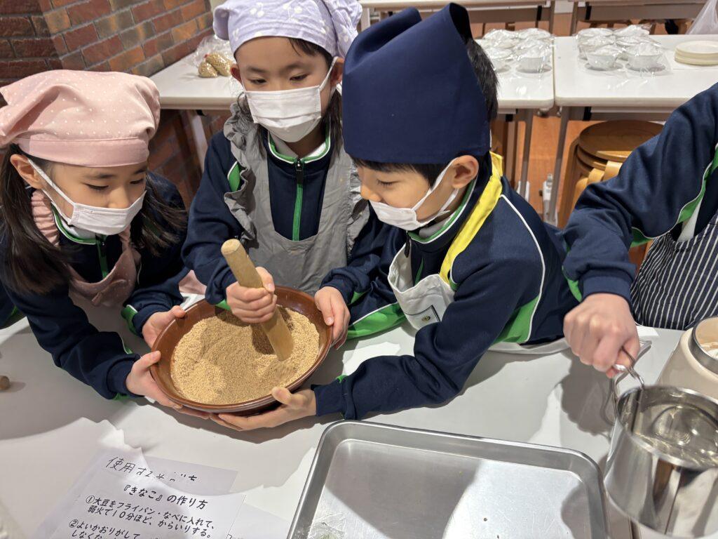 校内中に大豆を煎ったかぐわしい香りが漂って、他学年の児童たちも大勢のぞきに来ました。どの行程も交代しながら協力して楽しんだり、でき上がった「白玉団子きなこまぶし」をうれしそうに味わったりしていました。