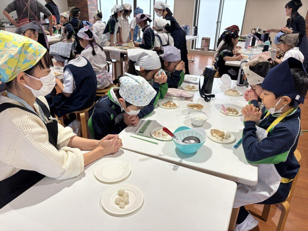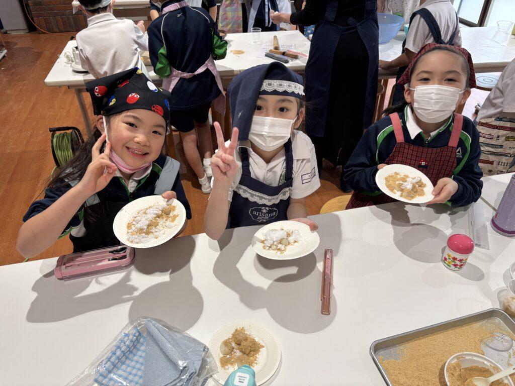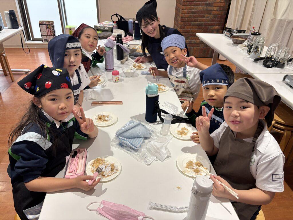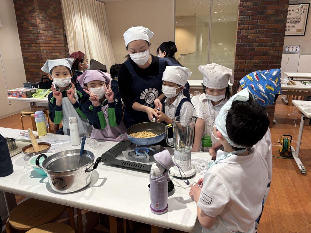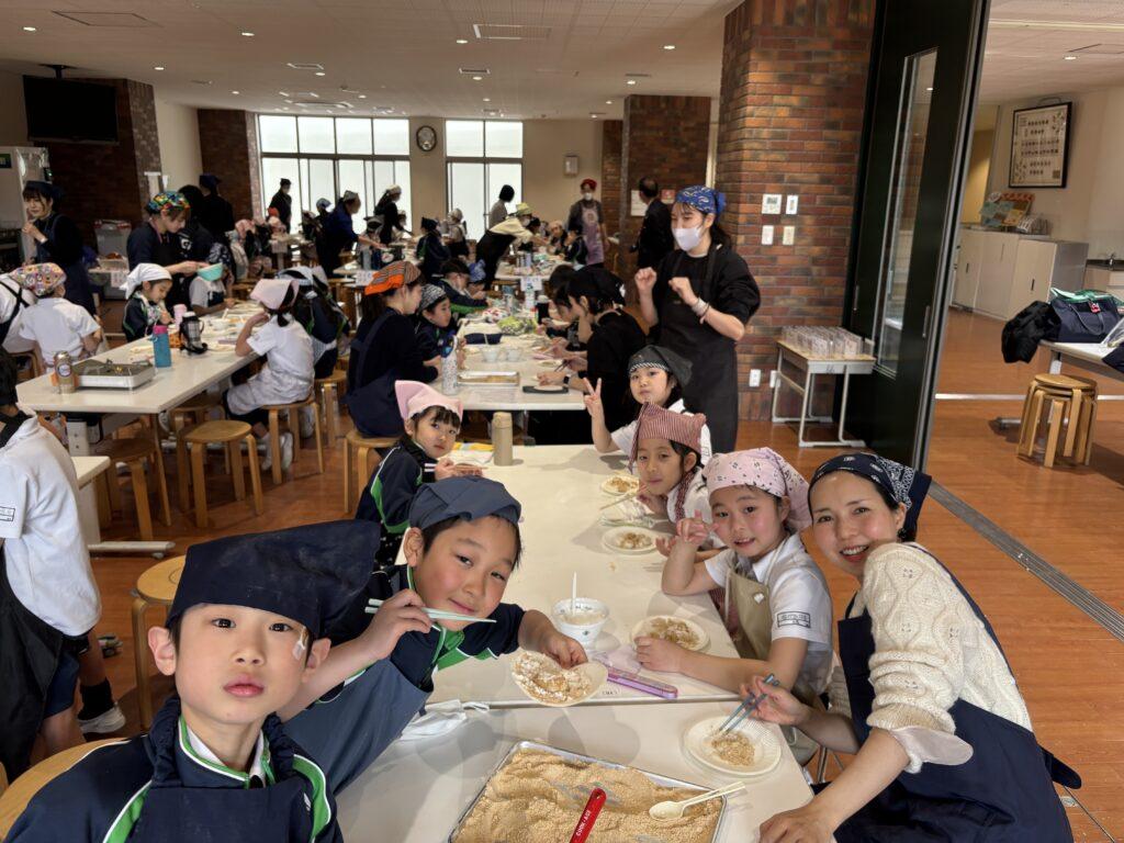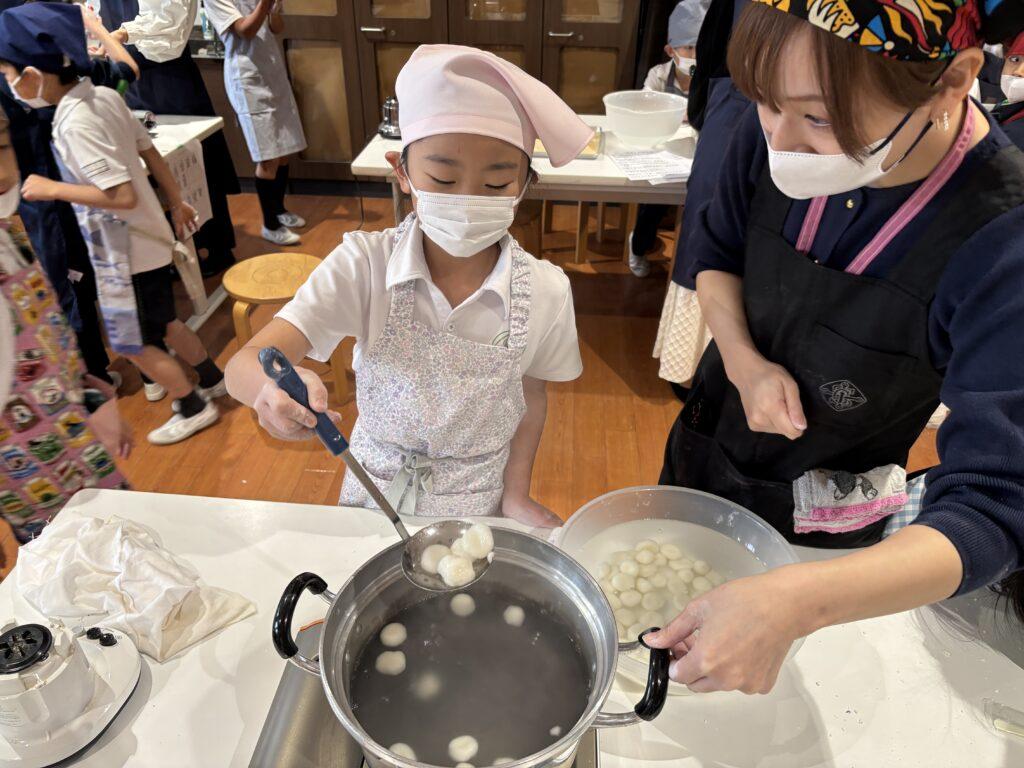 校内中に大豆を煎ったかぐわしい香りが漂って、他学年の児童たちも大勢のぞきに来ました。どの行程も交代しながら協力して楽しんだり、でき上がった「白玉団子きなこまぶし」をうれしそうに味わったりしていました。