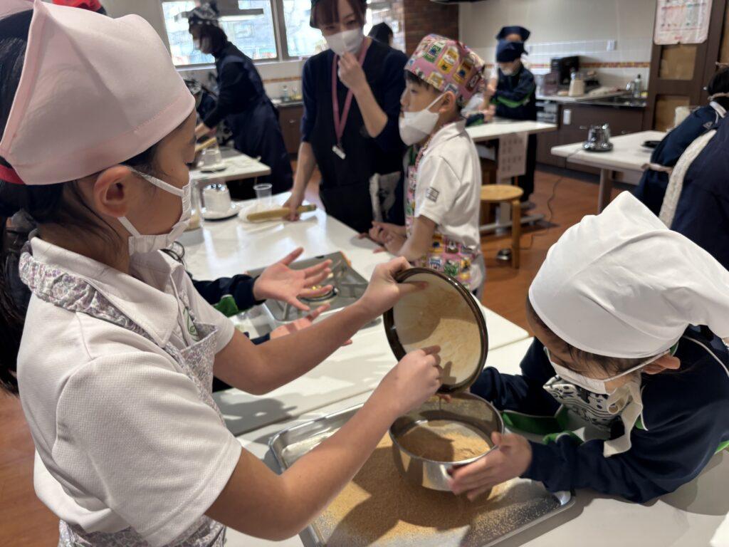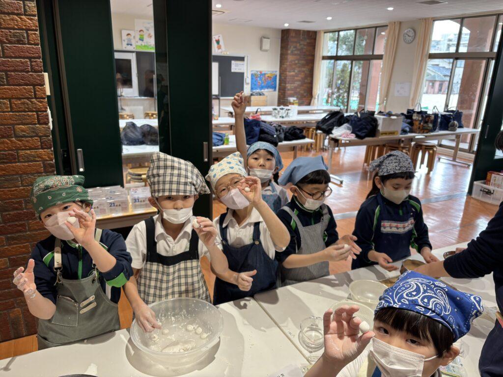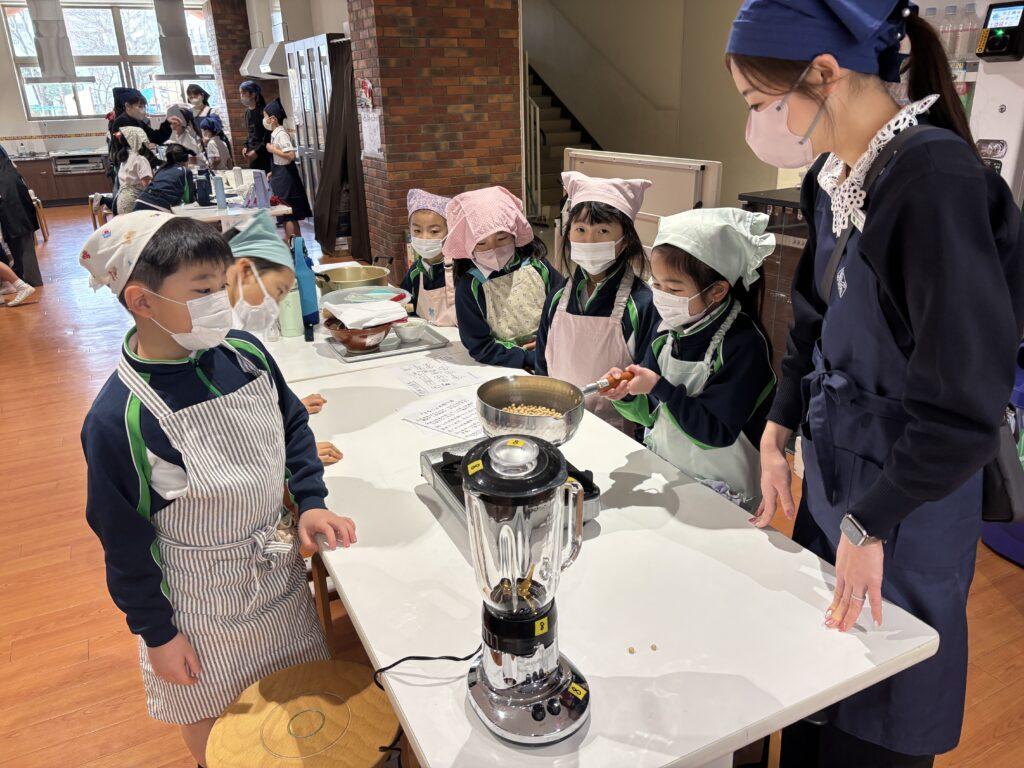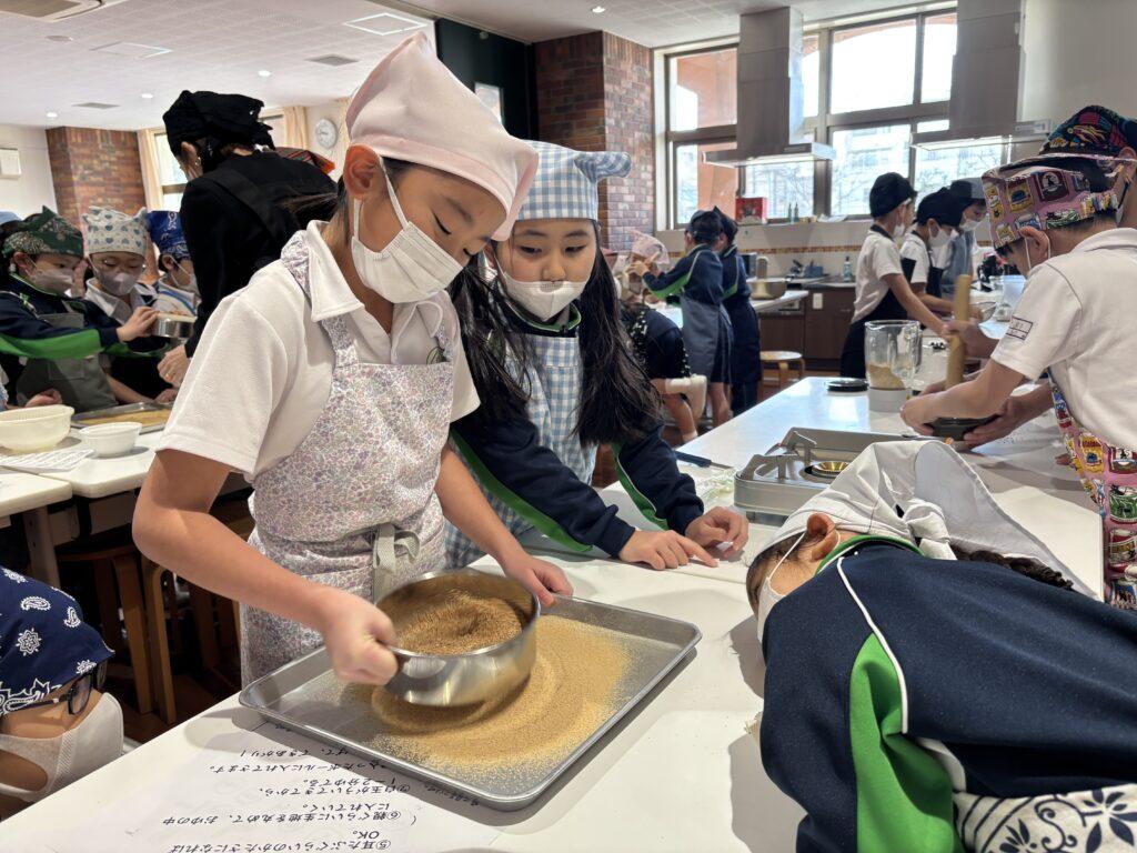 2年生は5月に山形県・伊藤ファームの伊藤先生から「いのちの授業」をしていただき、「大豆」を蒔いて育ててきました。1月21日(水)、大豆の学びの最後は「きなこ作り」。手作りの白玉団子にまぶしてみんなで食べるのがゴールです。1階オリーブホールでお手伝いのお母様たちのお力を借り、瞳を輝かせながら挑戦しました。