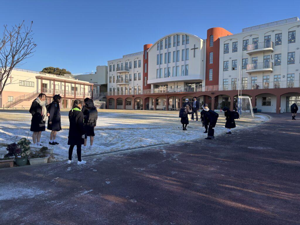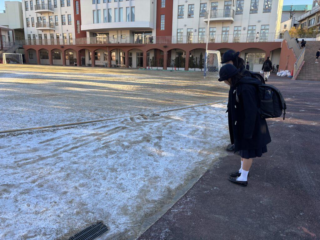 1月22日(木)登校した子どもたちは、校庭にうっすらと積もった雪にびっくり。雪をそっと手に乗せて冷たさを味わったり、友だちと投げ合ったりして冬の風物詩を楽しんでいる子どもたちもいました。