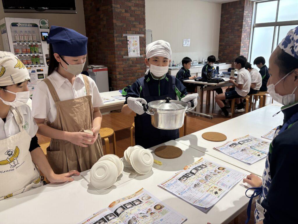 5年 調理実習② 投稿日 2026年1月28日 更新日 2026年2月3日 著者 s_aiura カテゴリー スクールニュース 2月28日(水)2、3時間目に5年2組の出席番号後半チームの調理実習が行われました。月曜日、美味しそうなお味噌汁の香りが漂う中で静かに縫い物で待機していた子どもたちは意気揚々、ご飯とお味噌汁作りに励みました。ご飯を蒸らす時間にしっかり振り返りをし、お祈りをして「いただきます!」満面の笑みが並びました。 具を入れます! ちゃんと火は通ったかな? 先生の説明をよく聞いて 合わせ味噌を作っています ご飯、炊けました! 大成功!