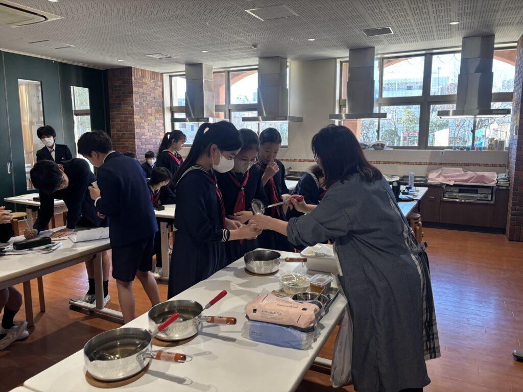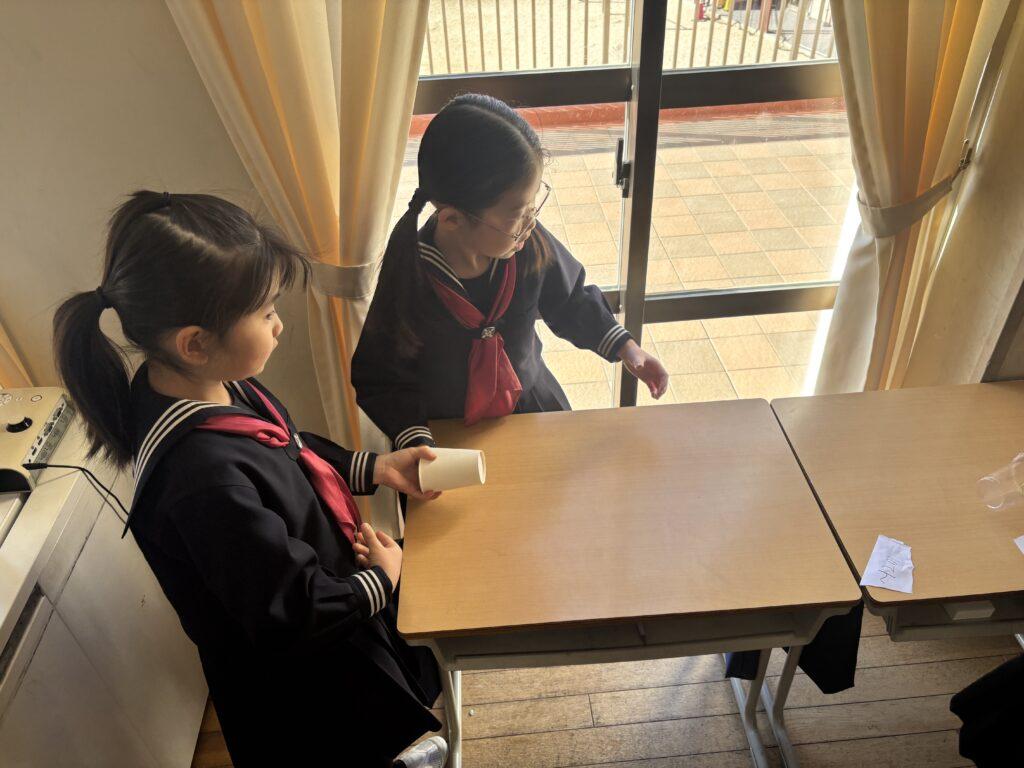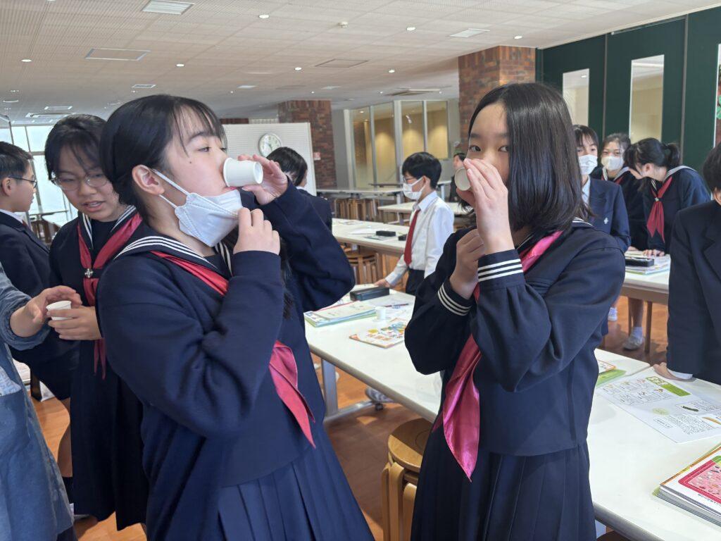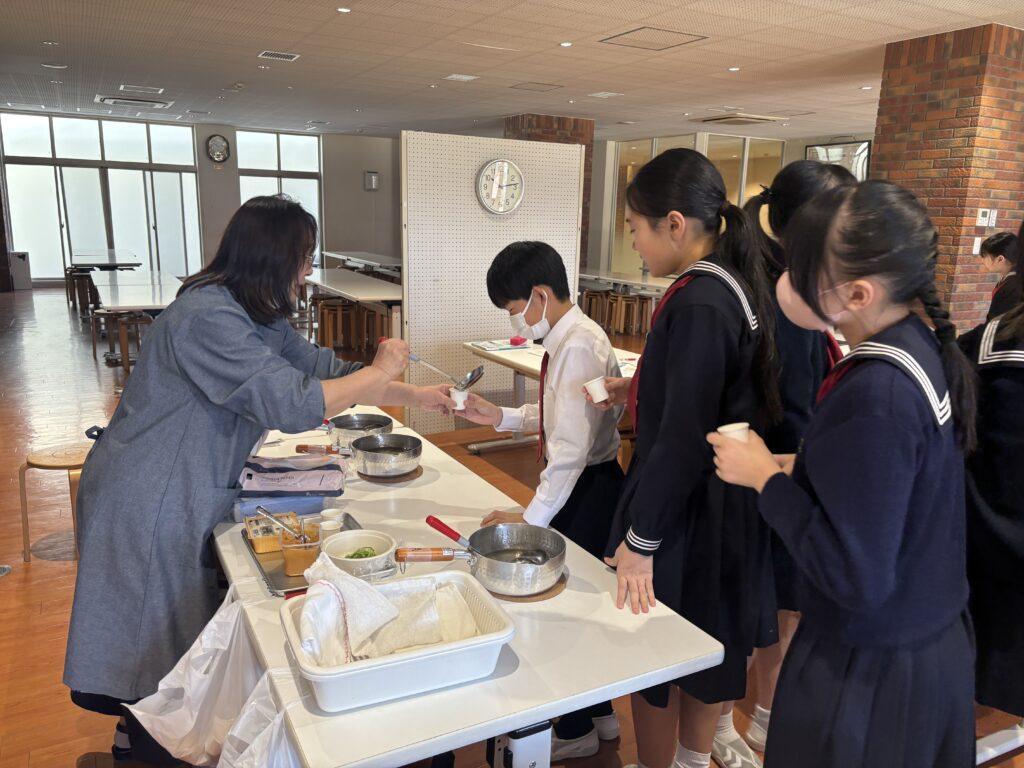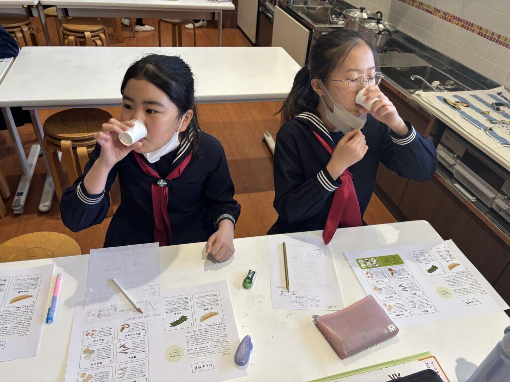 1月29日(木)「だしソムリエ」を目指して「利きだし」をした6年生。雪平鍋に入ったABCDEのだし汁を飲んで、「こんぶ・煮干し・干ししいたけ・かつお節・ほんだし」のどれかを当てます。味だけでなく、香りや色も見ながら「ちょっと苦い!」「しいたけは匂いでわかる!」とあれこれ考えていました。合わせだしにして飲み比べたり、お豆腐とネギと味噌を入れ、お味噌汁にして飲んだりとさまざまな味を楽しみました。将来、役立つことでしょう。