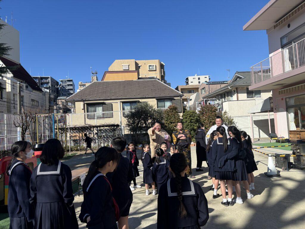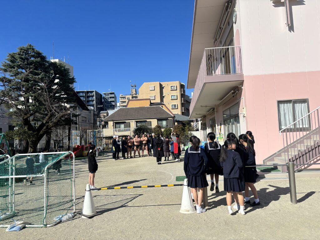 お隣の聖学院幼稚園の園庭では、玉ノ井部屋の力士の方々がお餅つき。「よいしょ!」「よいしょ!」と威勢のいい掛け声が響きます。20分休みには「幼稚園の時に来てくれた!」とうれしそうに力士の方々のところへ走っていく子どもたちもいました。