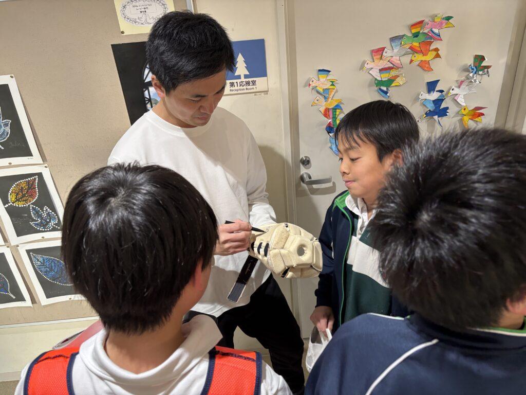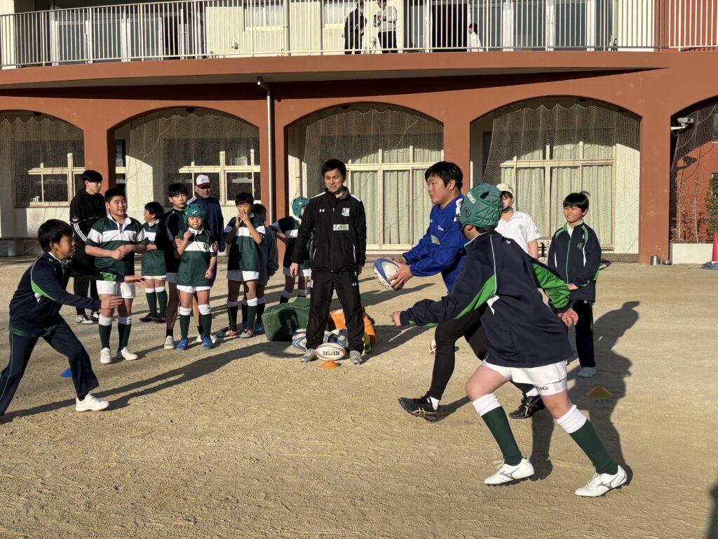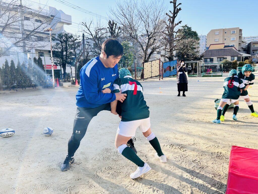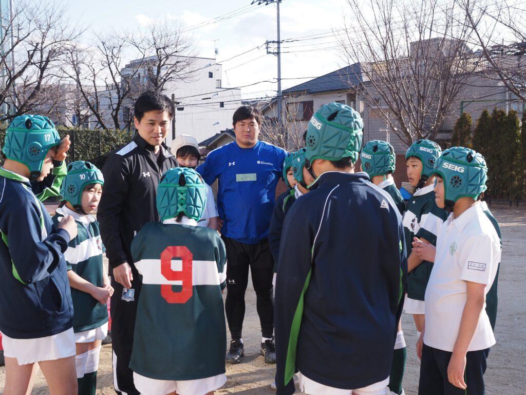 クラブの時間には、清水建設江東ブルーシャークスのラグビー選手がラグビークラブの練習に参加してくださいました。寒い中でしたが現役のラグビー選手とコーチの方から、パス回しやタックルの姿勢について直接ご指導いただき、実りある練習となりました。