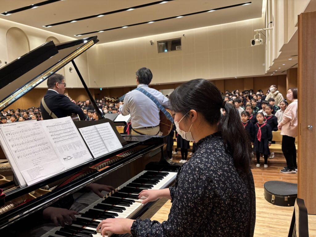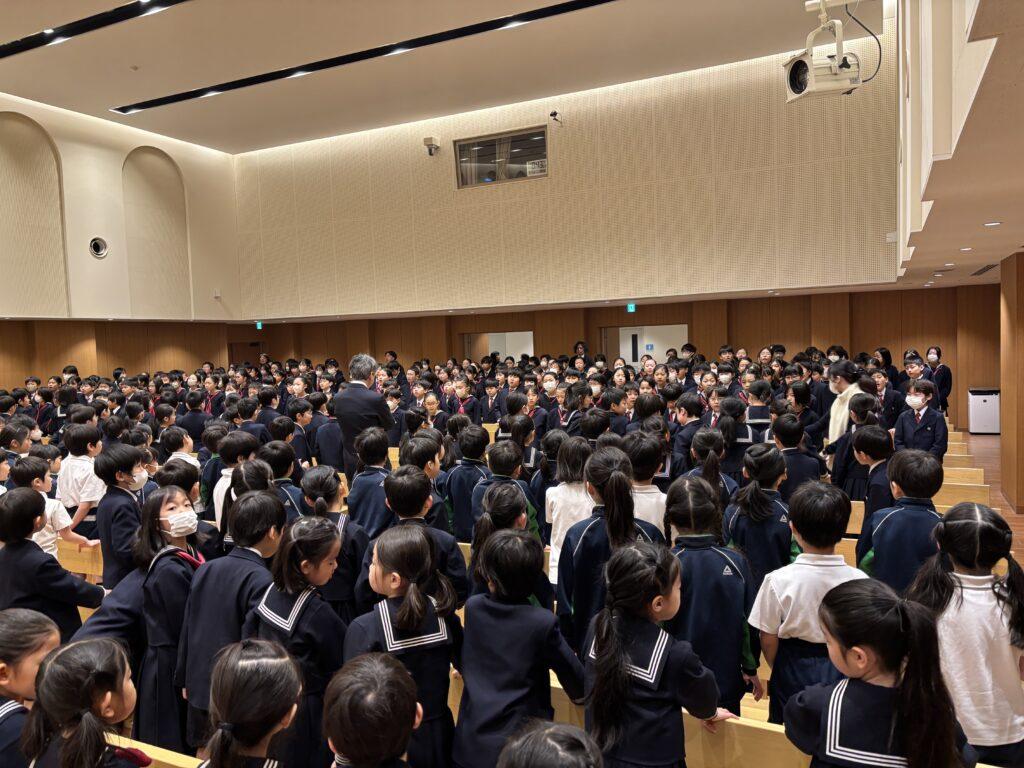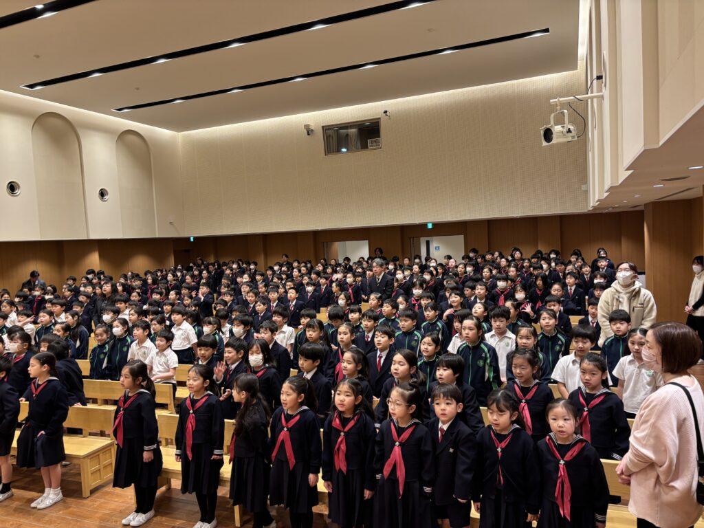 2月4日(水)、昨年度の水曜日は雨ばかりで讃美礼拝続きでしたが、ここのところずっと水曜日には雨が降らず、青空の下での校庭礼拝が続いていました。今日も晴れましたが久しぶりに全校賛美礼拝をささげることになり、元気よく声高らかに神様を賛美しました。