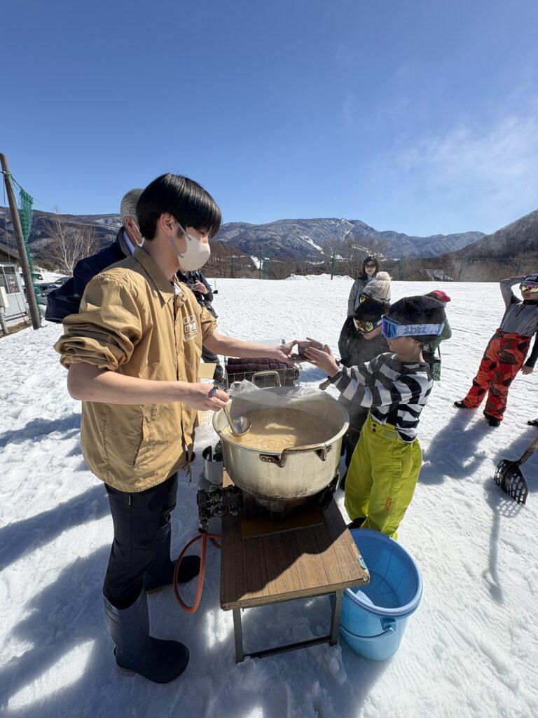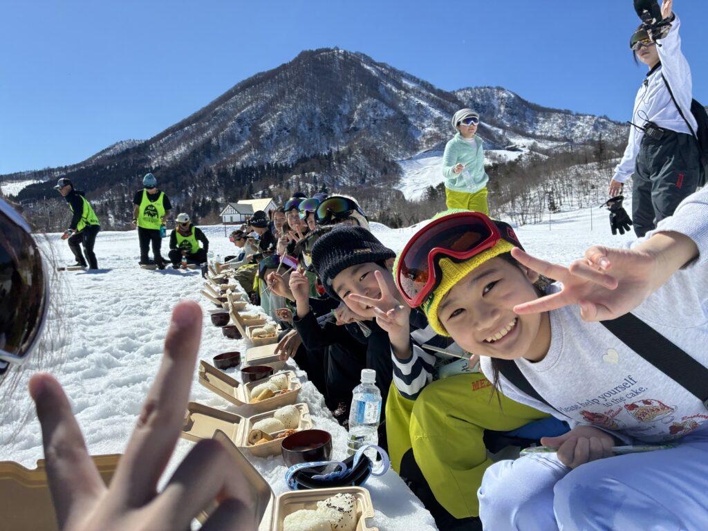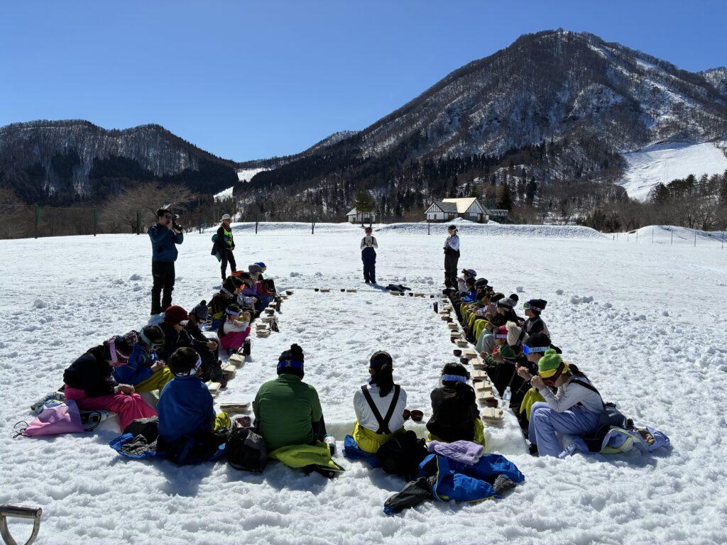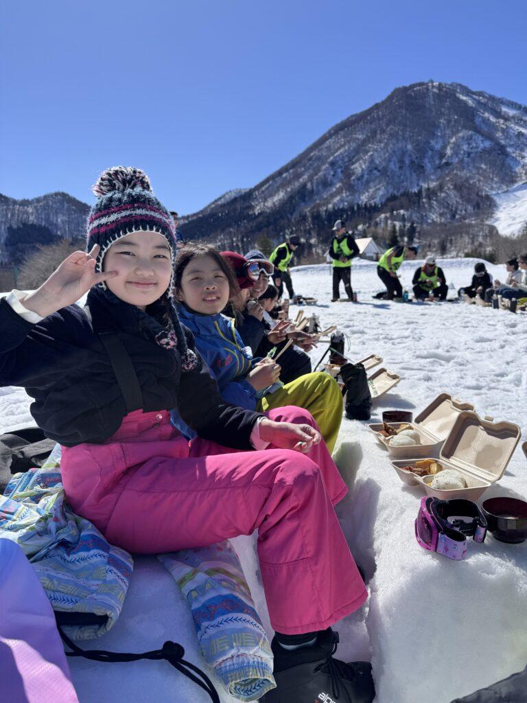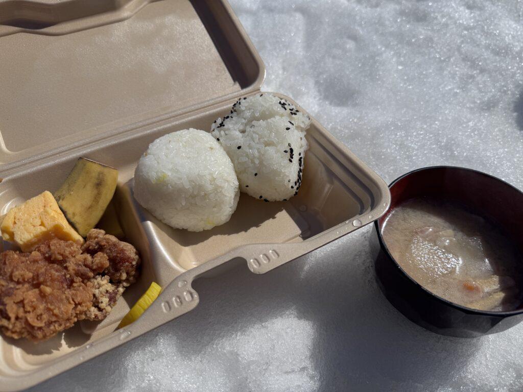 今日の昼食は特別です。雪のテーブルで熱々のとん汁とおにぎり、唐揚げ、バナナのお弁当をみんなでいただきました。先生たちが心を込めてつくった、チョコマシュマロがデザートです!