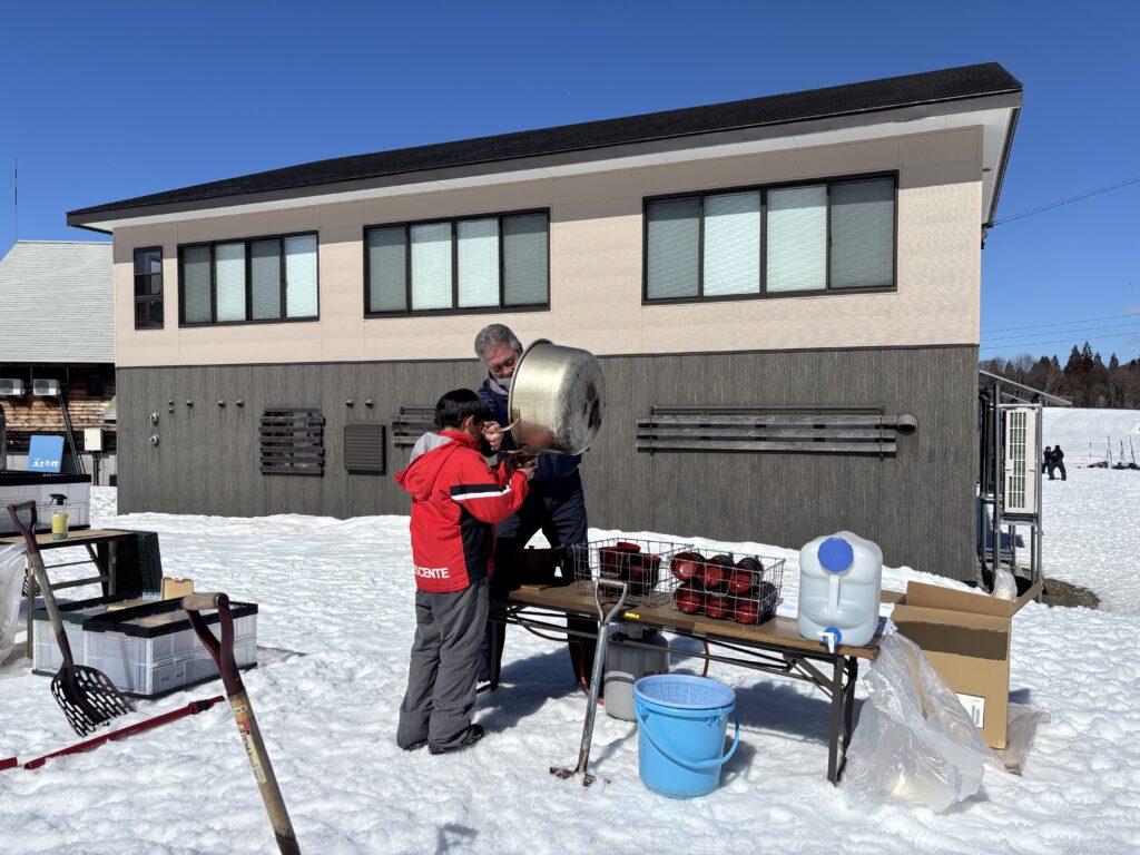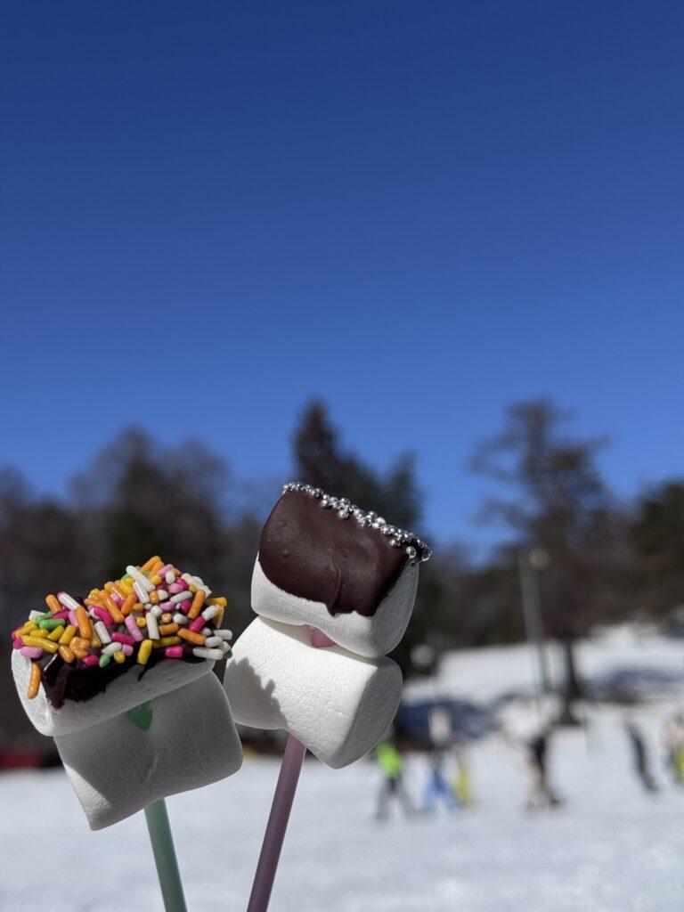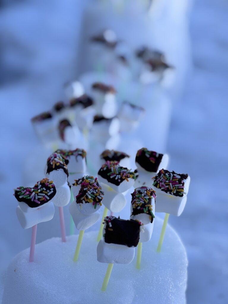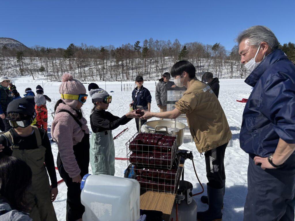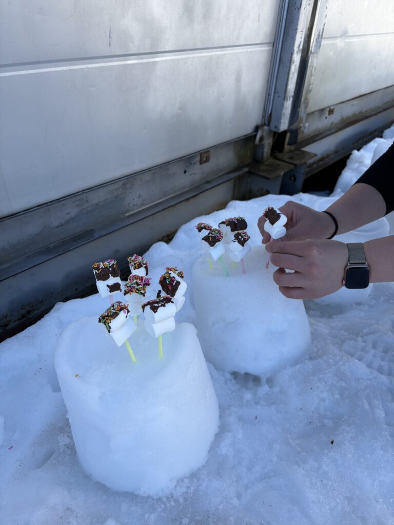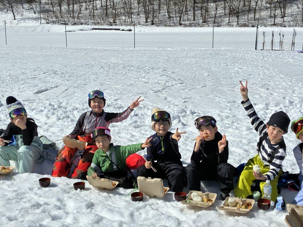 今日の昼食は特別です。雪のテーブルで熱々のとん汁とおにぎり、唐揚げ、バナナのお弁当をみんなでいただきました。先生たちが心を込めてつくった、チョコマシュマロがデザートです!