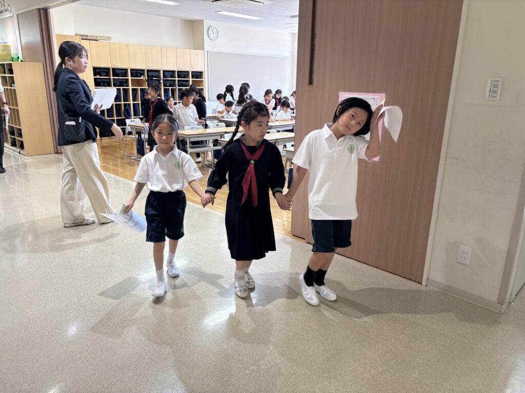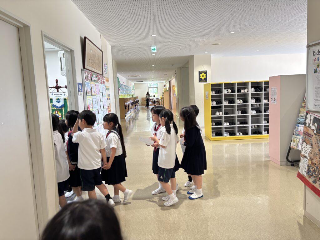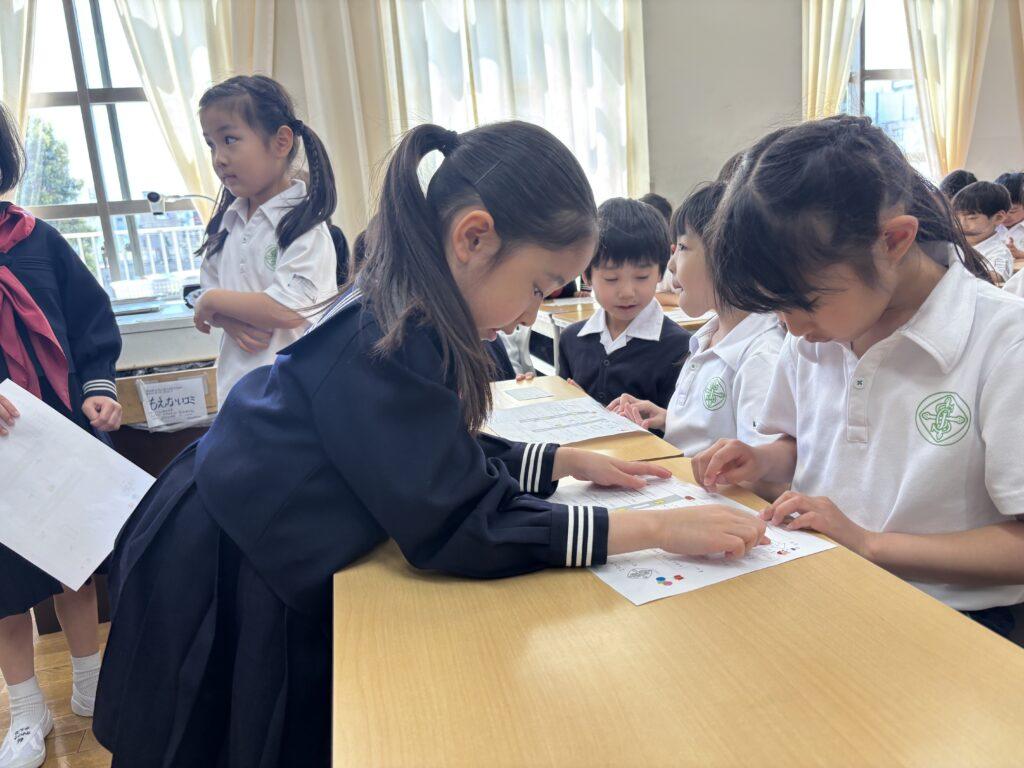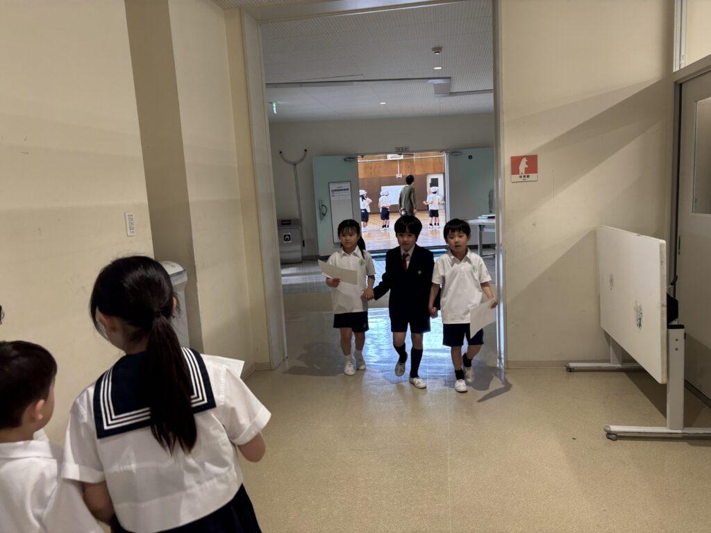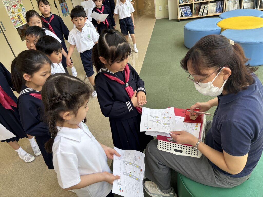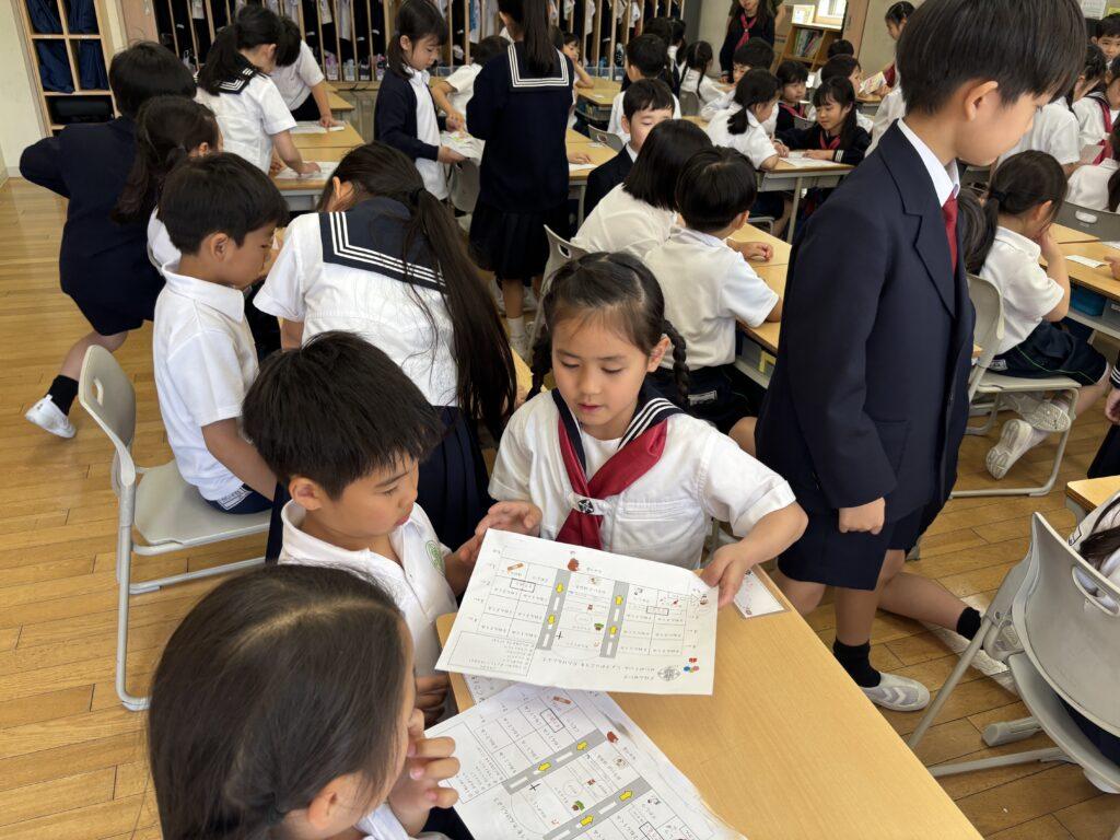 2年生が1年生のためにたくさん準備をして、学校探検をしました。ペアの1年生に渡す手作りの名刺と探検地図を持って、2年生がまず1年生を迎えに行きます。自己紹介をしてから地図を持ち、ペアで手をつないで学校探検に出発!校舎の中をあちこち巡り、図書室と体育館、そして校長室でスタンプを押してもらいました。ゴールの2年生教室では、絵本を一緒に読んだり、折り紙を2年生が折ってプレゼントしたりと楽しい時間を過ごしました。終わった後で、お昼休みに遊ぶ約束をしていたペアもいて、すっかり仲良くなった1年生と2年生でした。