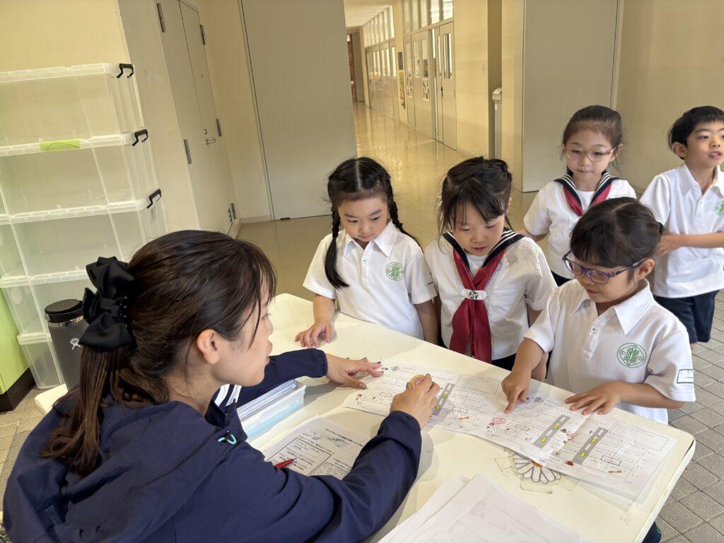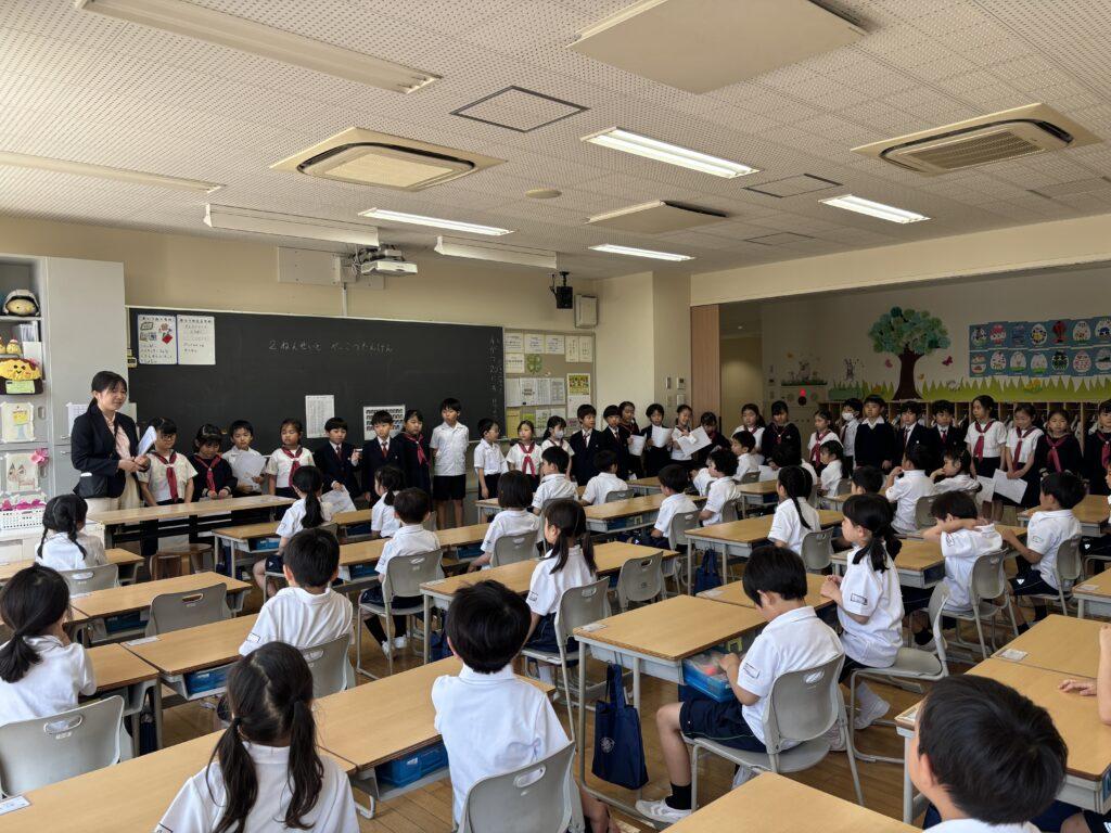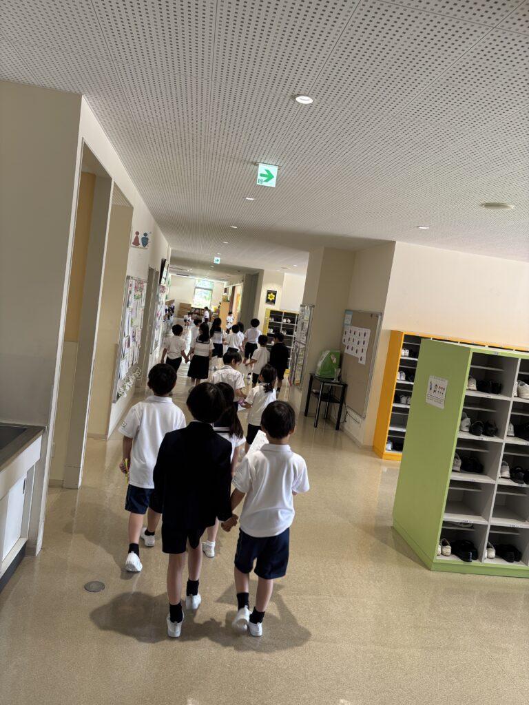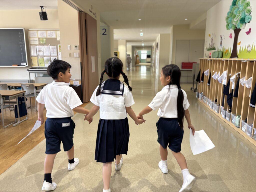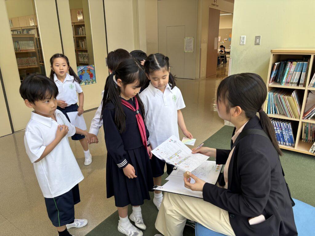 2年生が1年生のためにたくさん準備をして、学校探検をしました。ペアの1年生に渡す手作りの名刺と探検地図を持って、2年生がまず1年生を迎えに行きます。自己紹介をしてから地図を持ち、ペアで手をつないで学校探検に出発!校舎の中をあちこち巡り、図書室と体育館、そして校長室でスタンプを押してもらいました。ゴールの2年生教室では、絵本を一緒に読んだり、折り紙を2年生が折ってプレゼントしたりと楽しい時間を過ごしました。終わった後で、お昼休みに遊ぶ約束をしていたペアもいて、すっかり仲良くなった1年生と2年生でした。