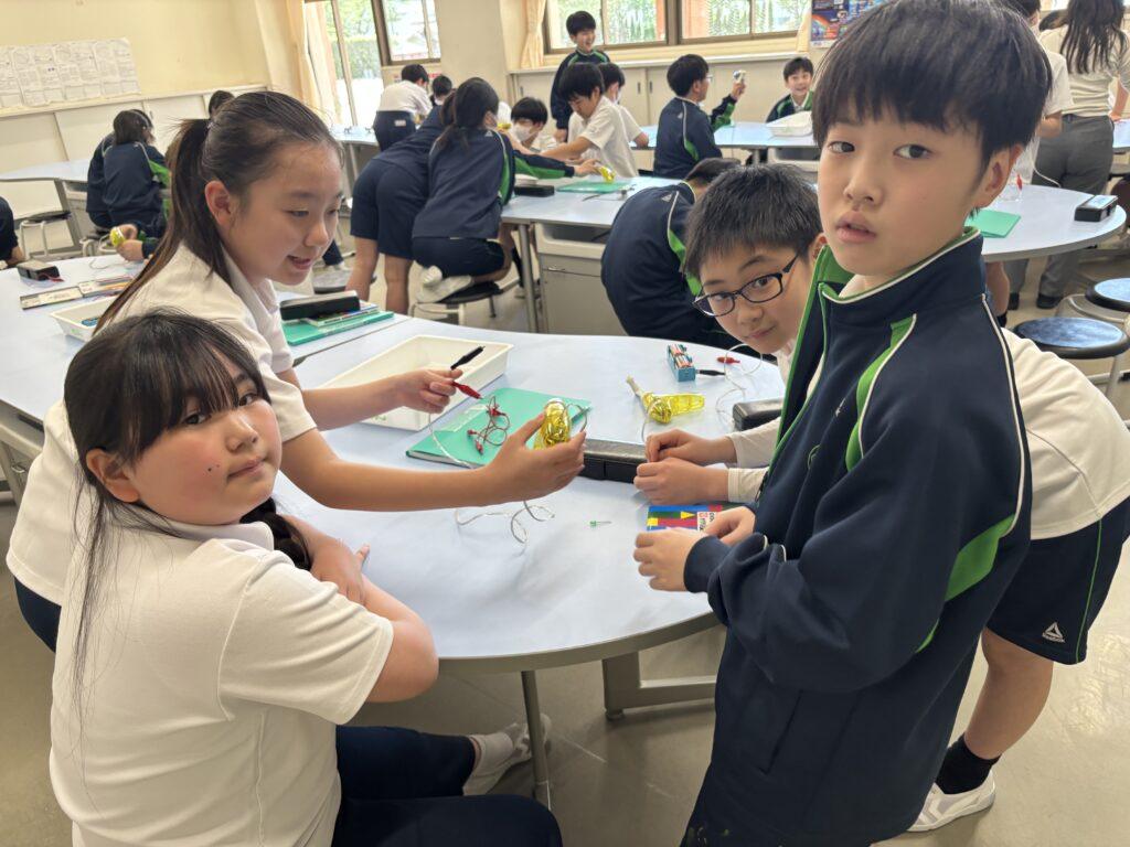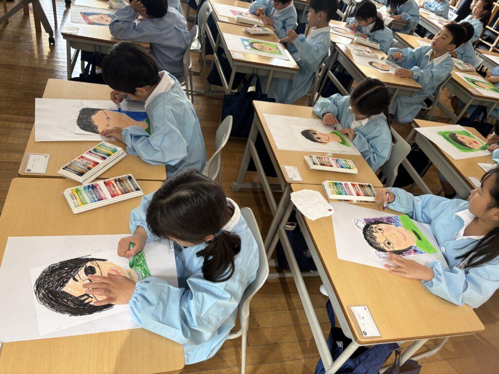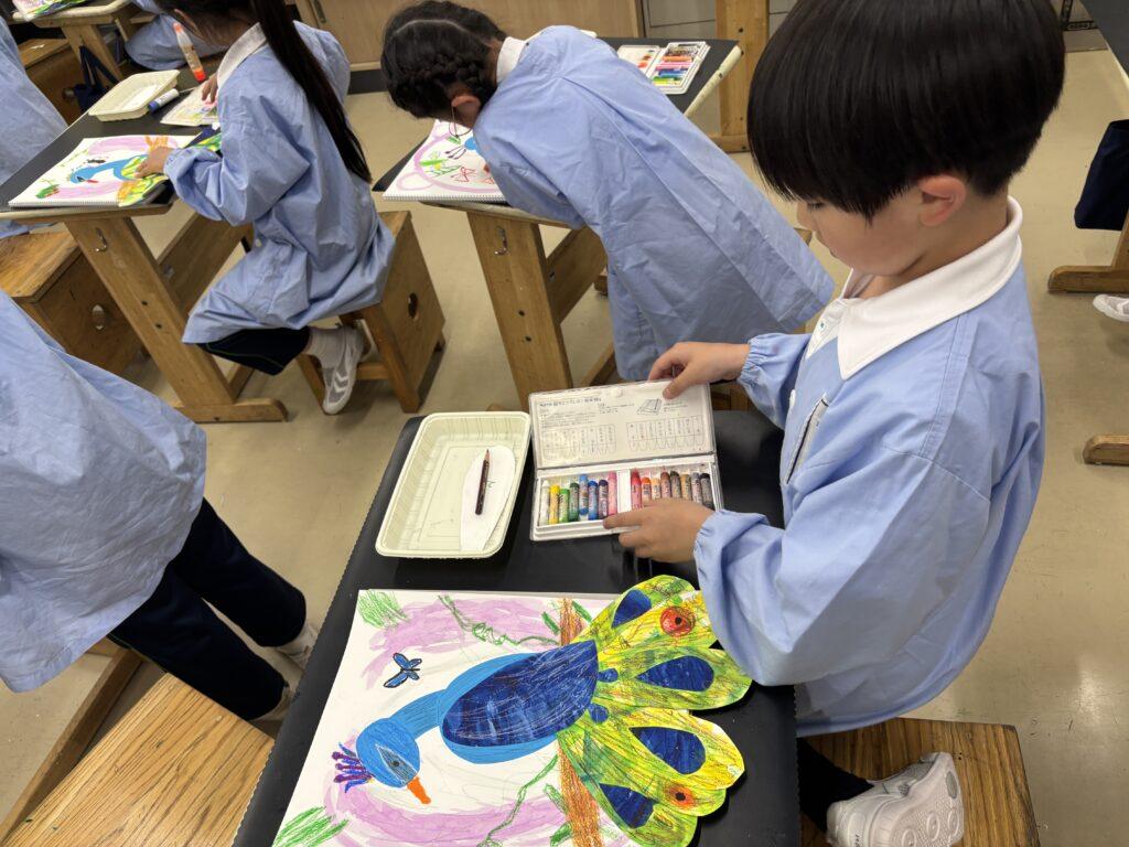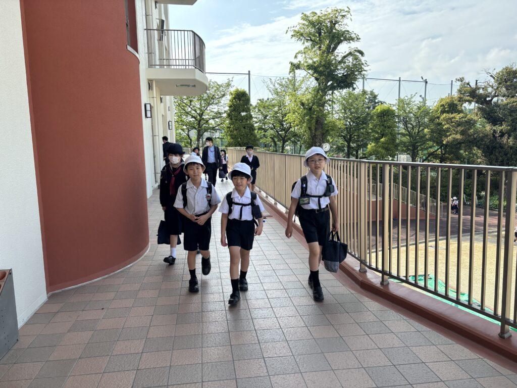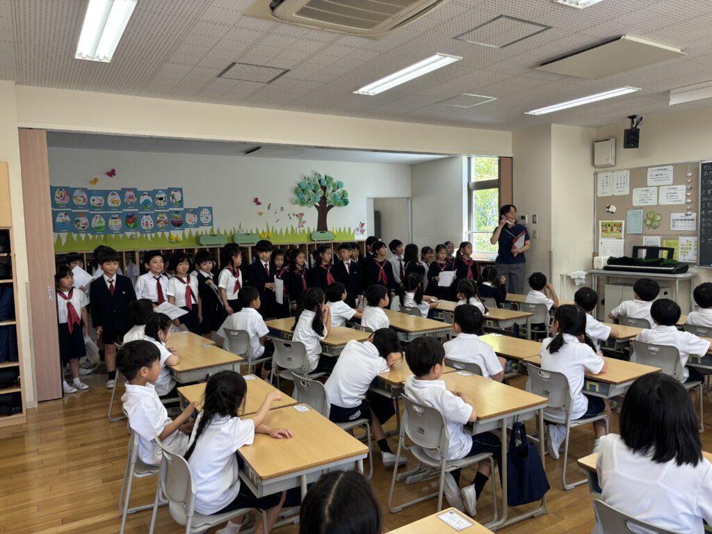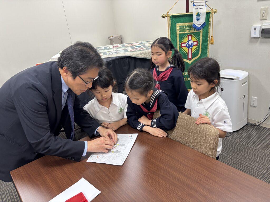 2年生が1年生のためにたくさん準備をして、学校探検をしました。ペアの1年生に渡す手作りの名刺と探検地図を持って、2年生がまず1年生を迎えに行きます。自己紹介をしてから地図を持ち、ペアで手をつないで学校探検に出発!校舎の中をあちこち巡り、図書室と体育館、そして校長室でスタンプを押してもらいました。ゴールの2年生教室では、絵本を一緒に読んだり、折り紙を2年生が折ってプレゼントしたりと楽しい時間を過ごしました。終わった後で、お昼休みに遊ぶ約束をしていたペアもいて、すっかり仲良くなった1年生と2年生でした。