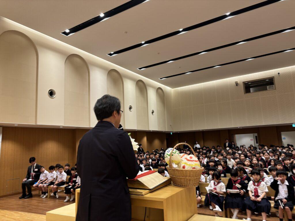 4月20日(月)、夏服に移行する期間がスタートしました。夏服姿、冬服姿が混ざったチャペルでは、イエス様の復活をお祝いするイースター礼拝がささげられました。